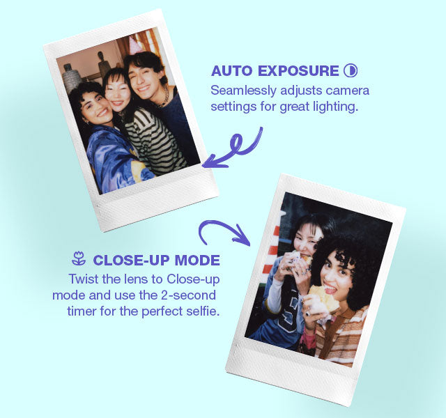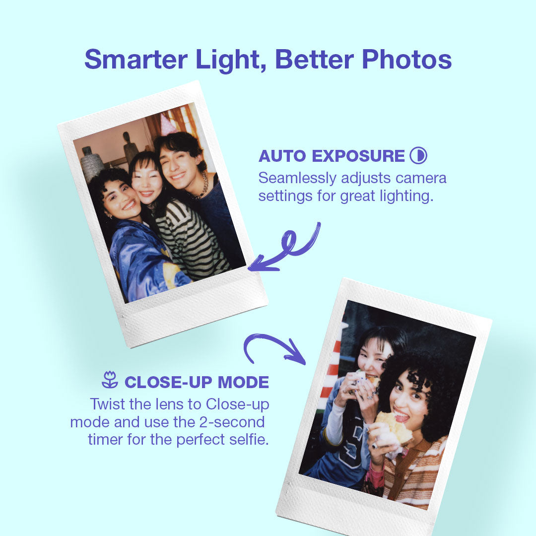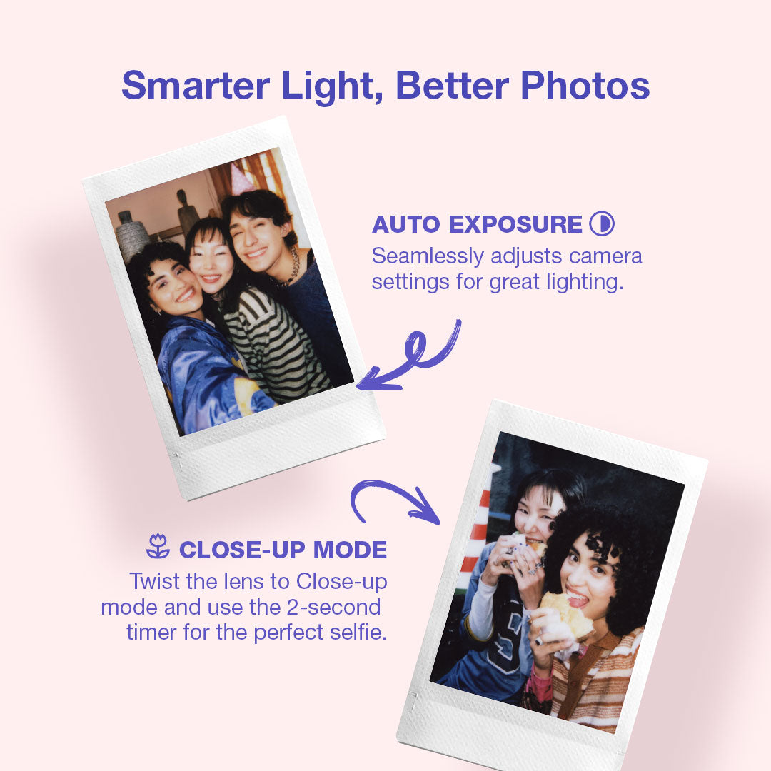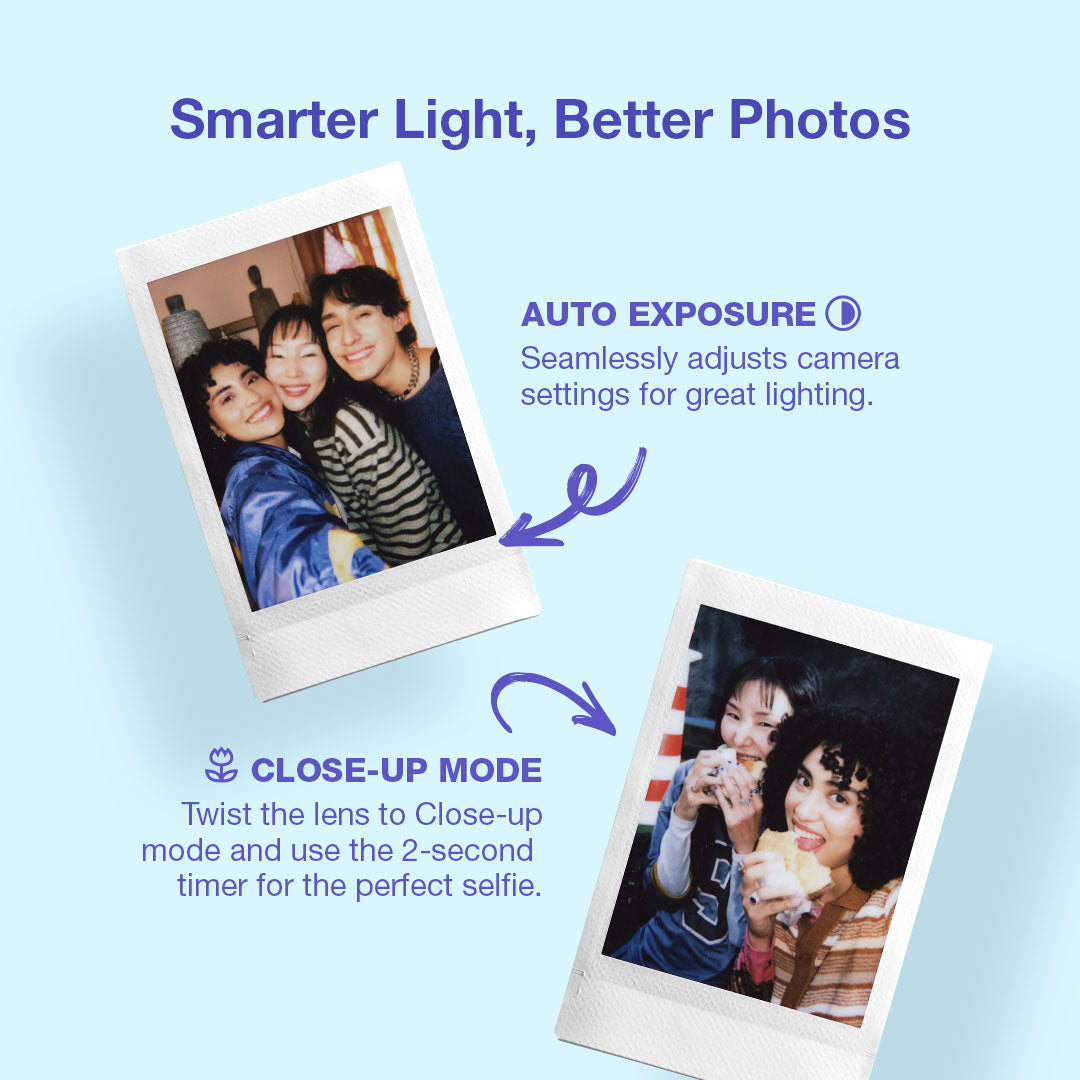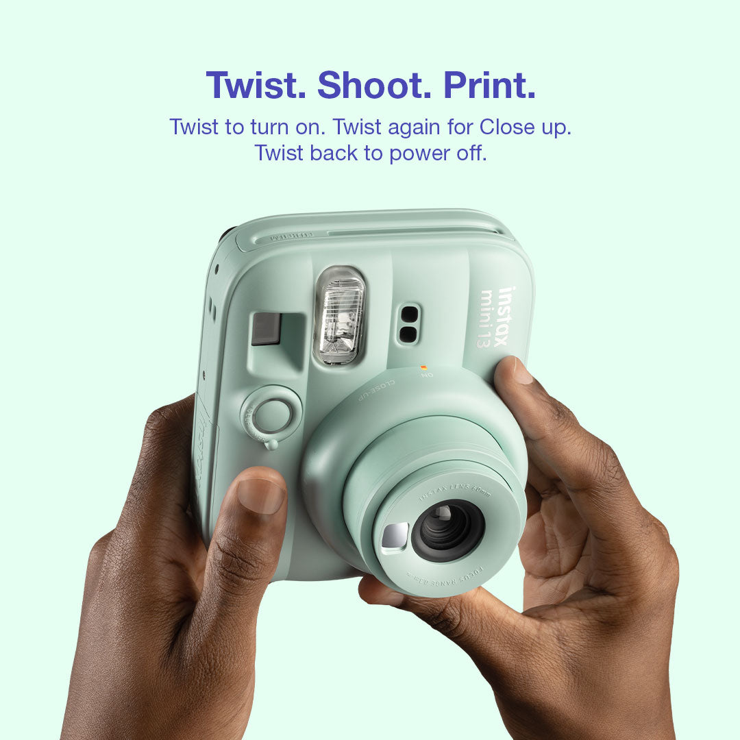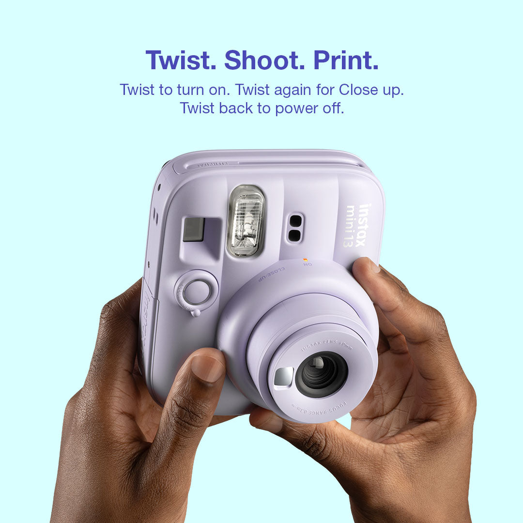 The instax mini 13™ is designed for simplicity and fun, making your daily moments instantly memorable. The camera comes with a mirror for selfies, a close-up lens, and simple controls for anyone to begin snapping immediately.