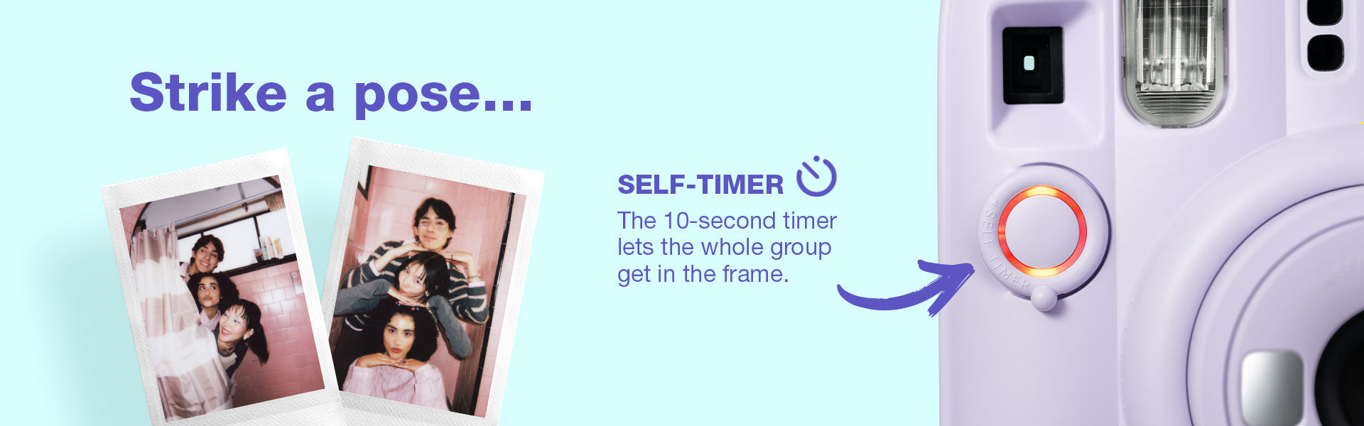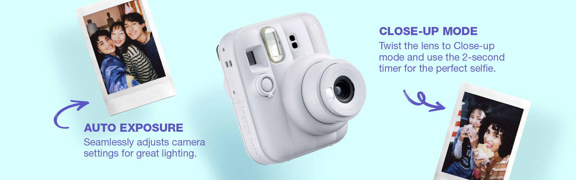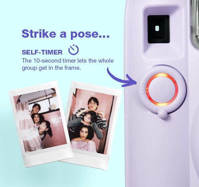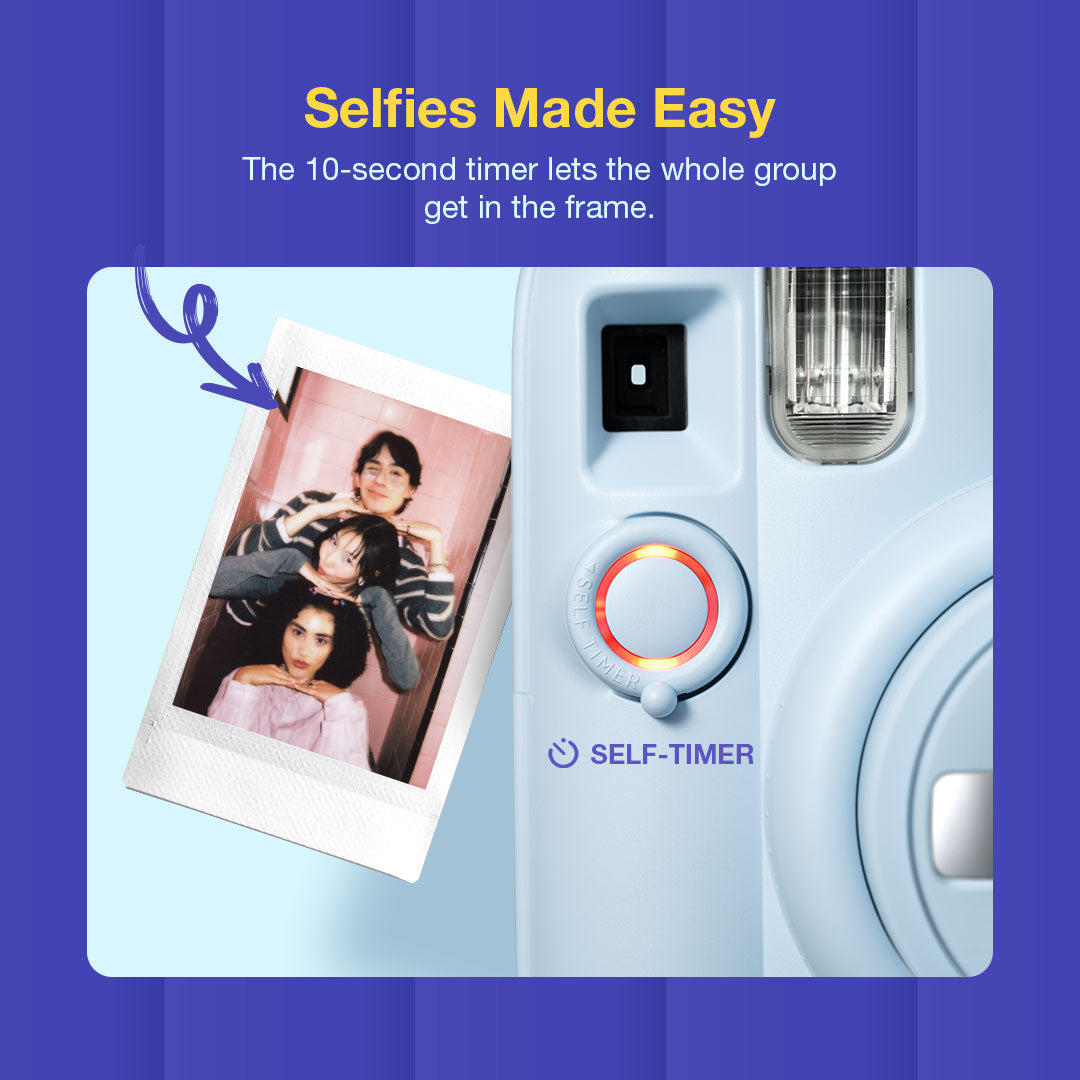 instax mini 13™ instant camera is a fun upgrade for instant camera lovers, offering simple features and colorful prints. It comes in 5 beautiful pastel shades, has auto exposure, selfie mode, and two self-timers for group shots.